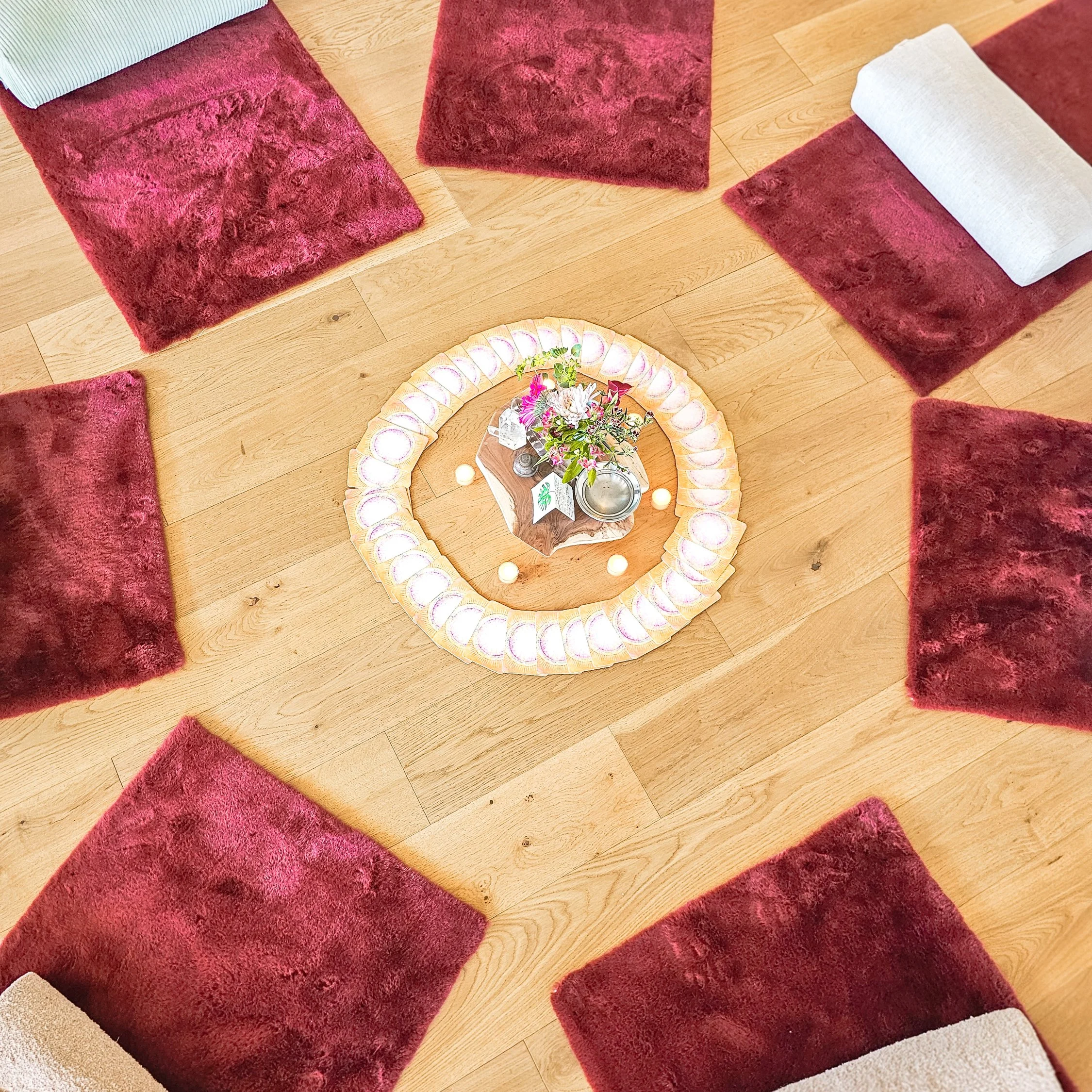 A Moon Circle is a guided ritual gathering aligned with the lunar cycle. Expect astrology, journaling, cacao, and sound meditation — all woven together to help you release, reset, and return to your own inner compass.